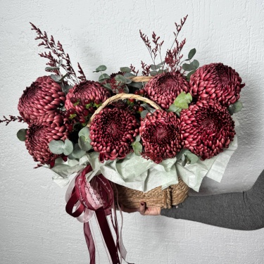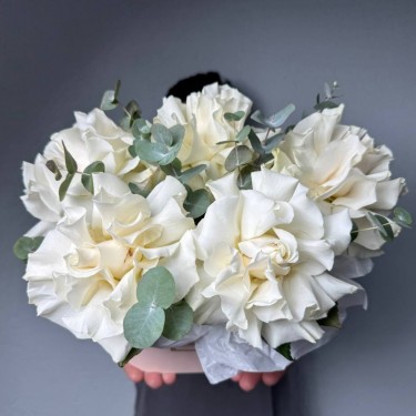 Коробка «5 кустовых роз и 4 кустовых хризантем с эвкалиптом»